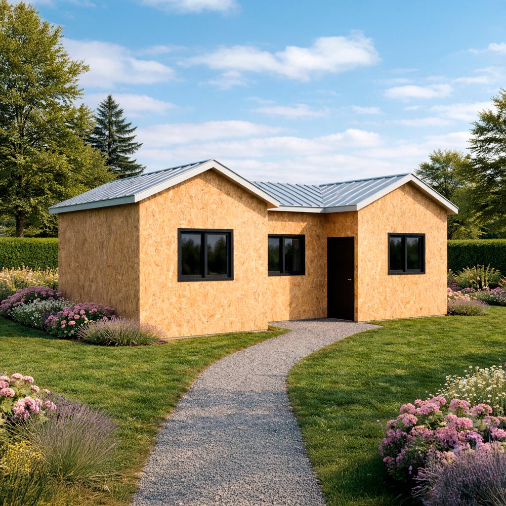 >Paneles perimetrales revestidos con OSB, tinglado o media luna, incluye barrera de vapor fieltro asfáltico.