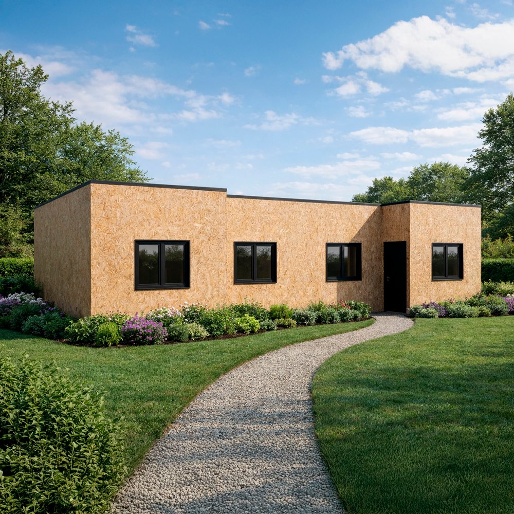 >Paneles perimetrales revestidos con OSB, tinglado o media luna, incluye barrera de vapor fieltro asfáltico.